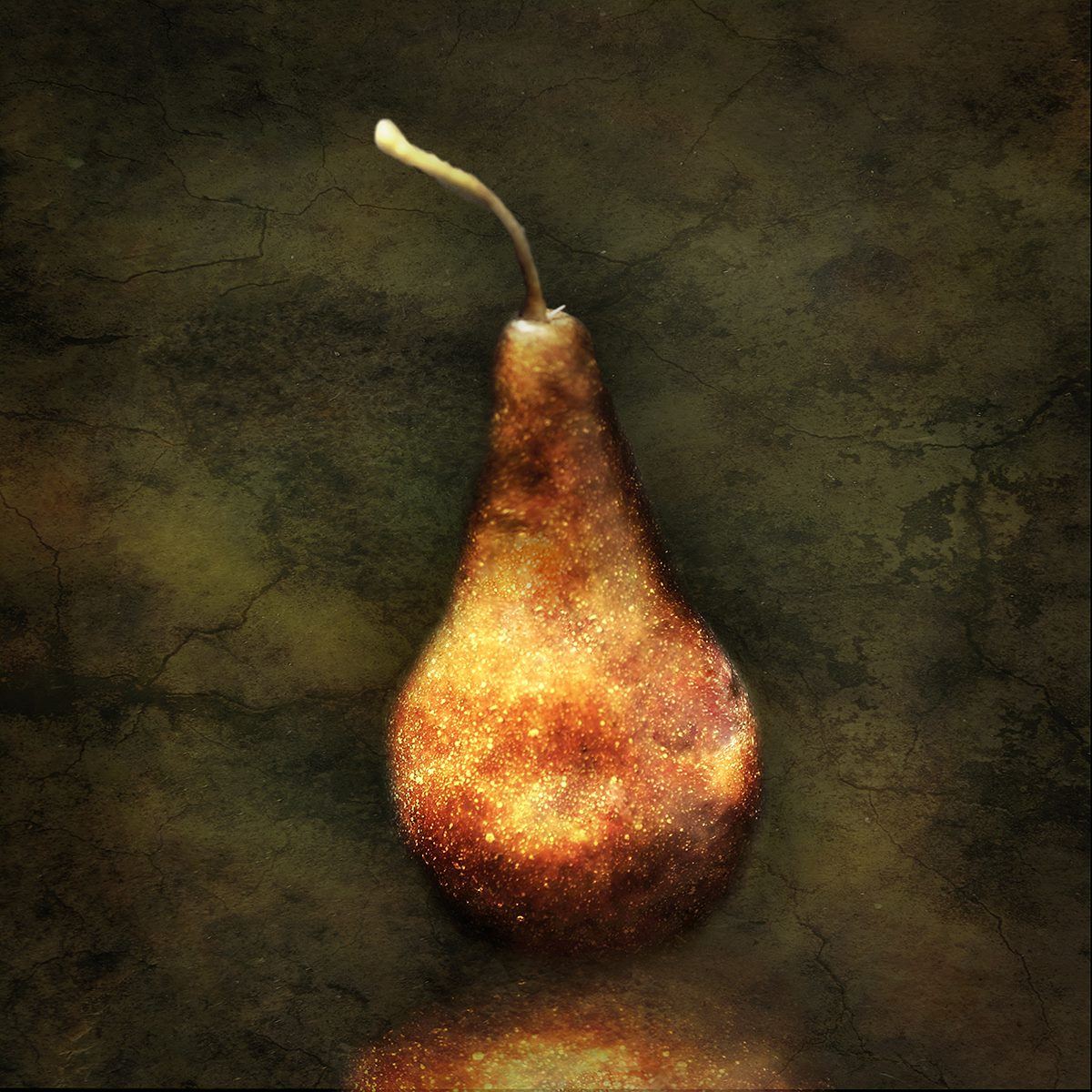 This still life of a Bosc Pear owes little less to digital trickery than first appear. I shot this pear in my backyard and hit it with a very bright light. And hitting it with a bright light brought out all this psychedelic colour and texture in the pear that give it the distinctive look in the still life.