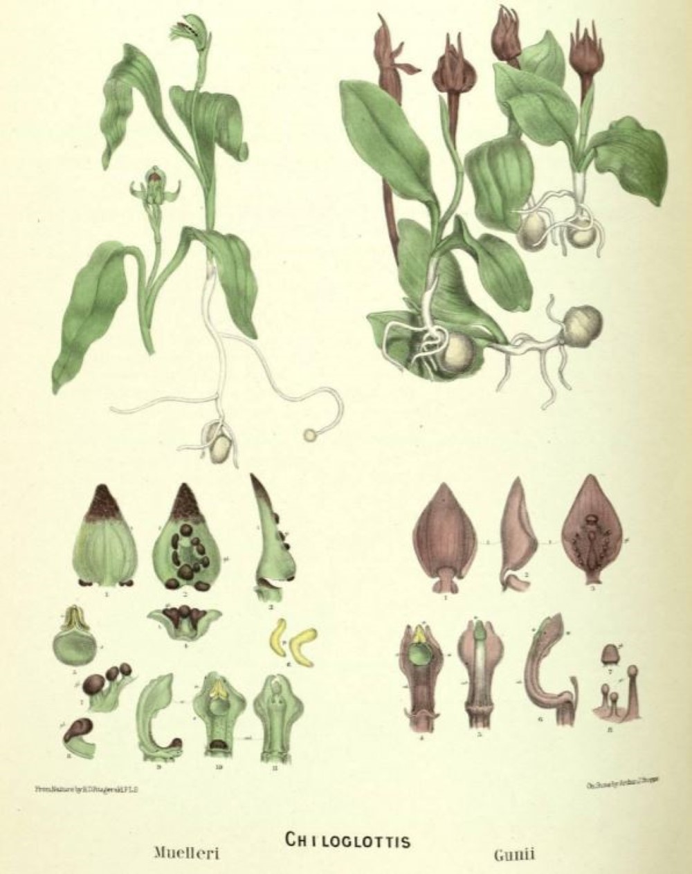 This plate of Chiloglottis muelleri (left) and Chiloglottis gunii (right) is from Part 7, October 1882. Fitzgerald describes Chiloglottis gunii as common in Tasmania, and Chiloglottis muelleri as found at the Loddon River in Victoria.