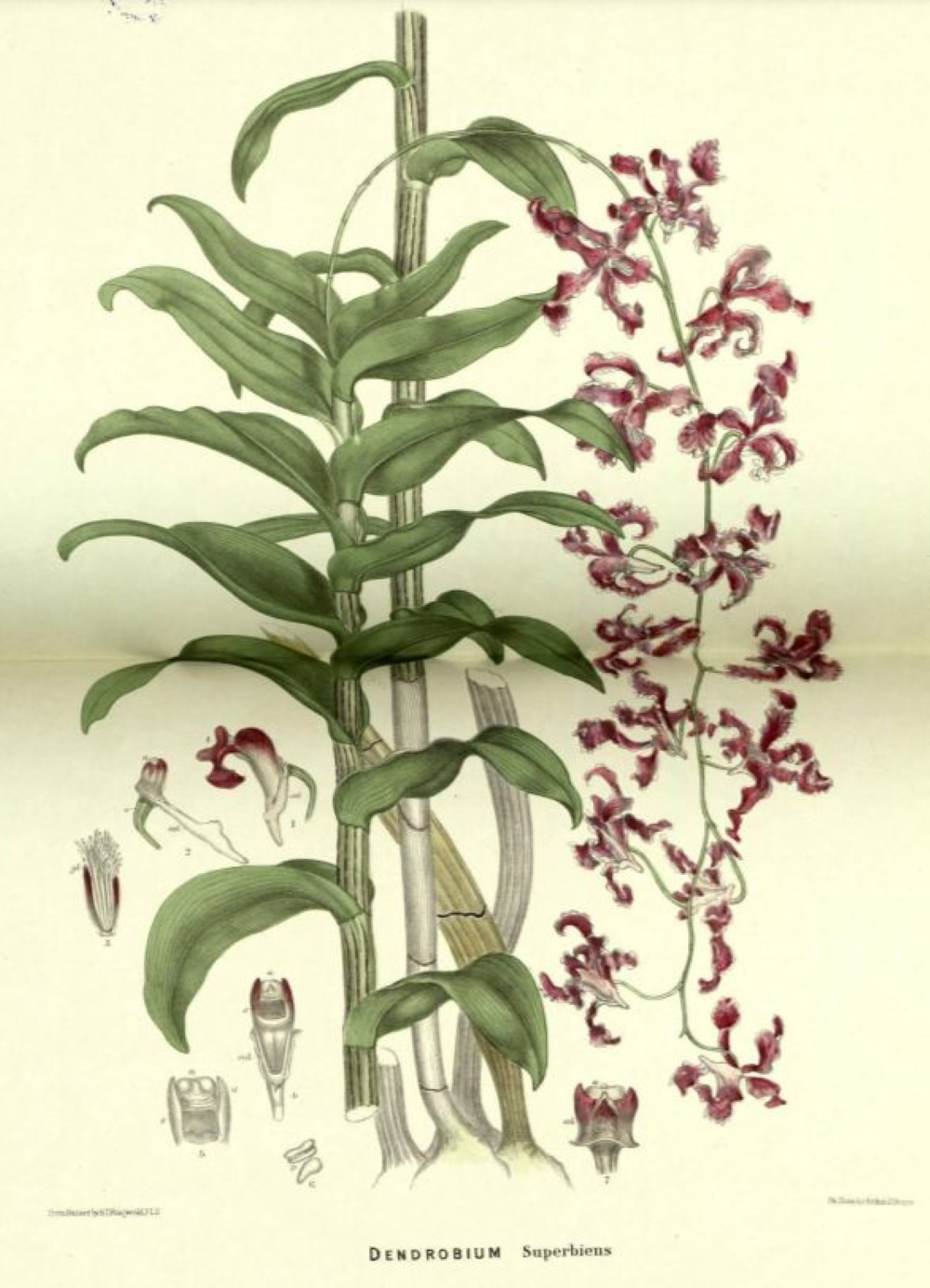 This plate of Dendrobium superbiens is from Part 7, October 1882. This figure is "taken from a plant grown in the green-house of the late Sir William Macarthur, and obtained from North Queensland."