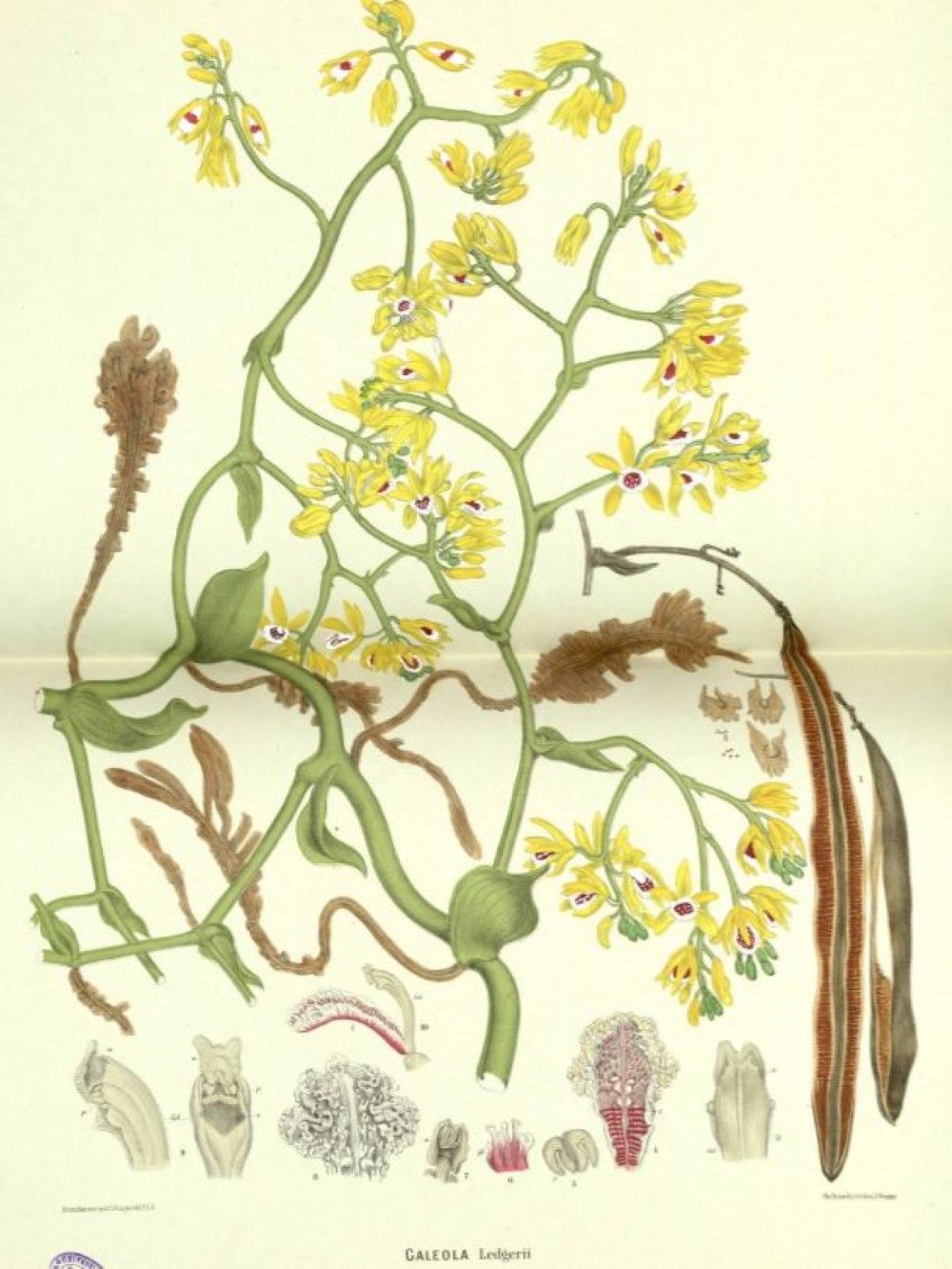 This plate is from Part 7, October 1882 and features Galeola Ledgerii . This species is "only to be found in the dense cedar scrubs on the east coast, and not further south.. than the Macleay River".