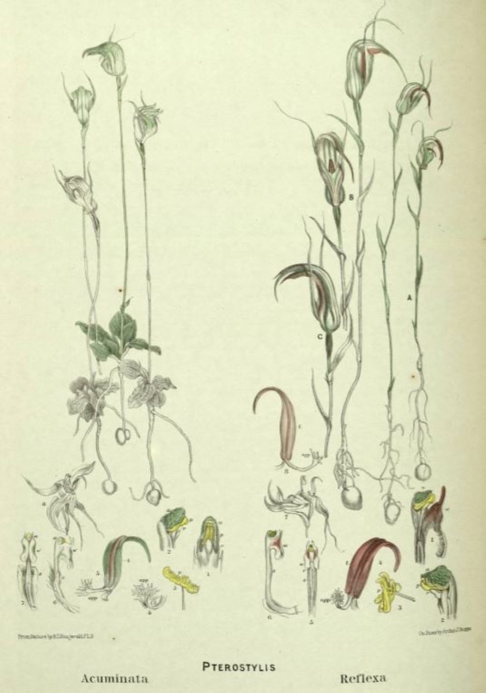 This plate is taken from Part 5, October 1879 and features Pterostylis acuminata (left) and Pterostylis reflexa (right). The author notes that acuminata grows near Sydney in peaty and sandy soils under trees. Reflexa also grows near Sydney on hillsides.