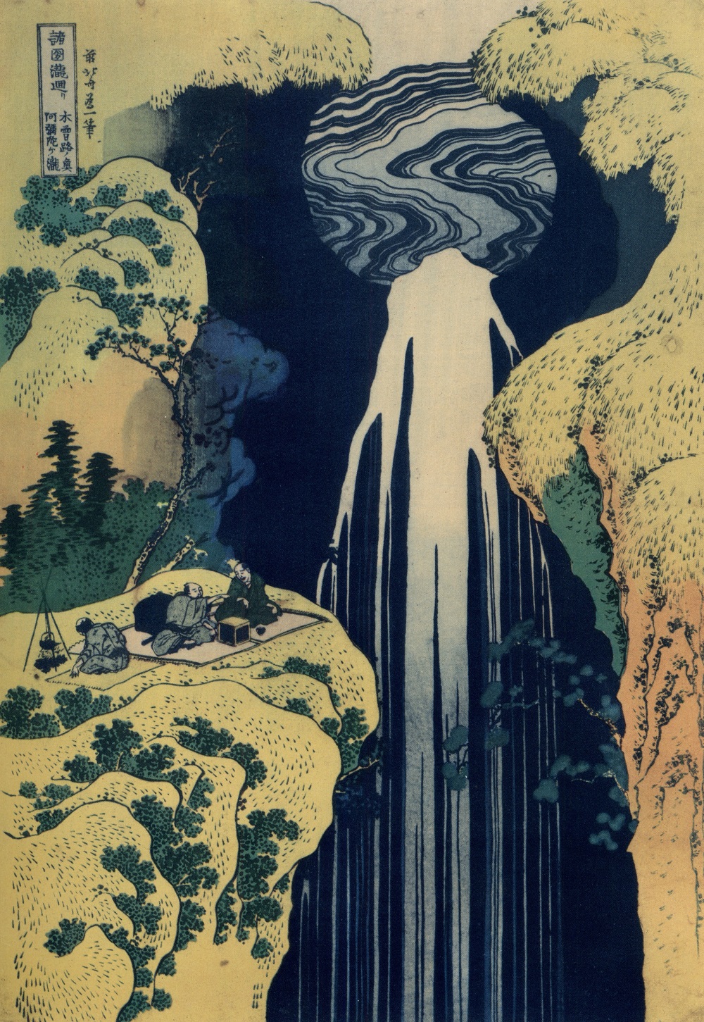 The Waterfall of Amida, so called from the resemblance of the round hollow worn in the cliff to the head of Amida Buddha. From the series of eight entitled 'Travelling Around Waterfall Country', this series can be called in some ways the most inimitable of all Hokusai's prints, with something extravagant and even bizarre in the daring conventions he employs to suggest the mass of falling water in each print.