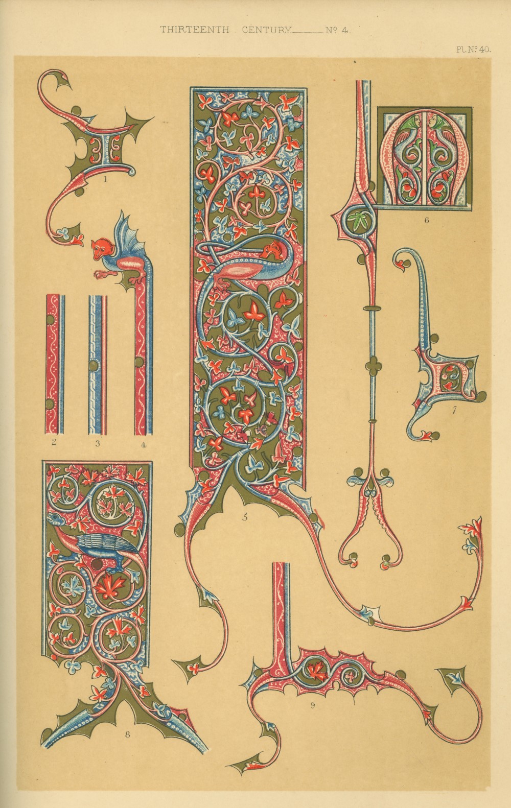 All the sparkling details engraved on this Plate are taken from the British Museum, viz., 1, 2, 3, 4, 5, 7, 8, and 9, from a copy of the Gospels (Add. MSS17,341), and Figure 6 from a Latin Bible (Bibl. Reg. 1 D 1). In the former of these manuscripts, executed probably in France in the latter part of the century, we may trace an evident inclination to depart from the conventional type of foliage common during the earlier part of the century, and a recurrence to that more direct imitation of nature which has always characterized those schools of art in which the professors have attained any marked amount of graphic dexterity.