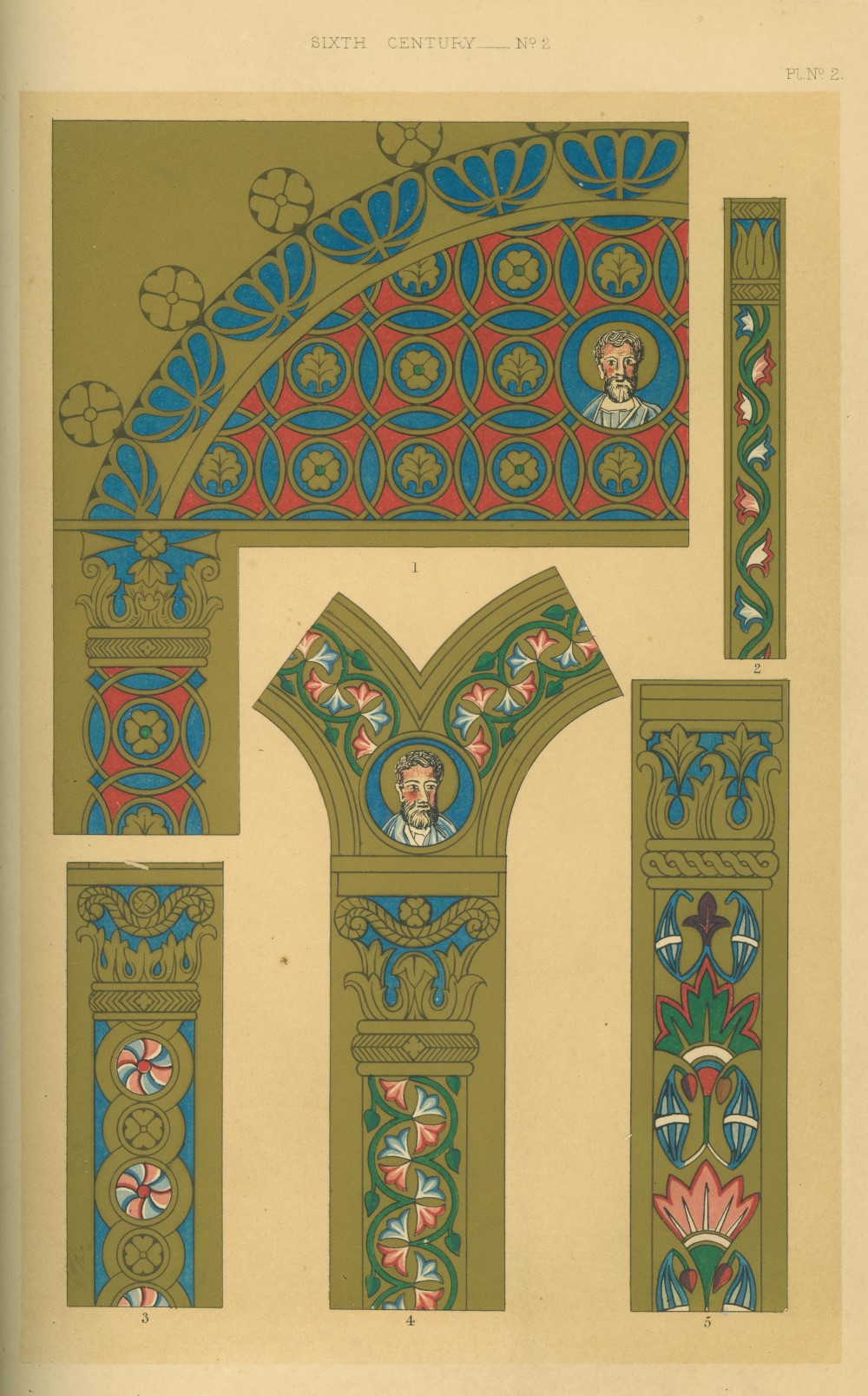 All of the beautiful specimens shown on this plate have been taken from the Golden Creek Canons of Eusebius, in the British Museum (Add. MSS*., No. 5111) one of the most important relics of the decoration school of Justinian the Great which time has spared to us. From its breadth of style and bold treatment of colour this MS. furnishes an excellent model for illuminators or decorators to study, reproduce, and improve upon.